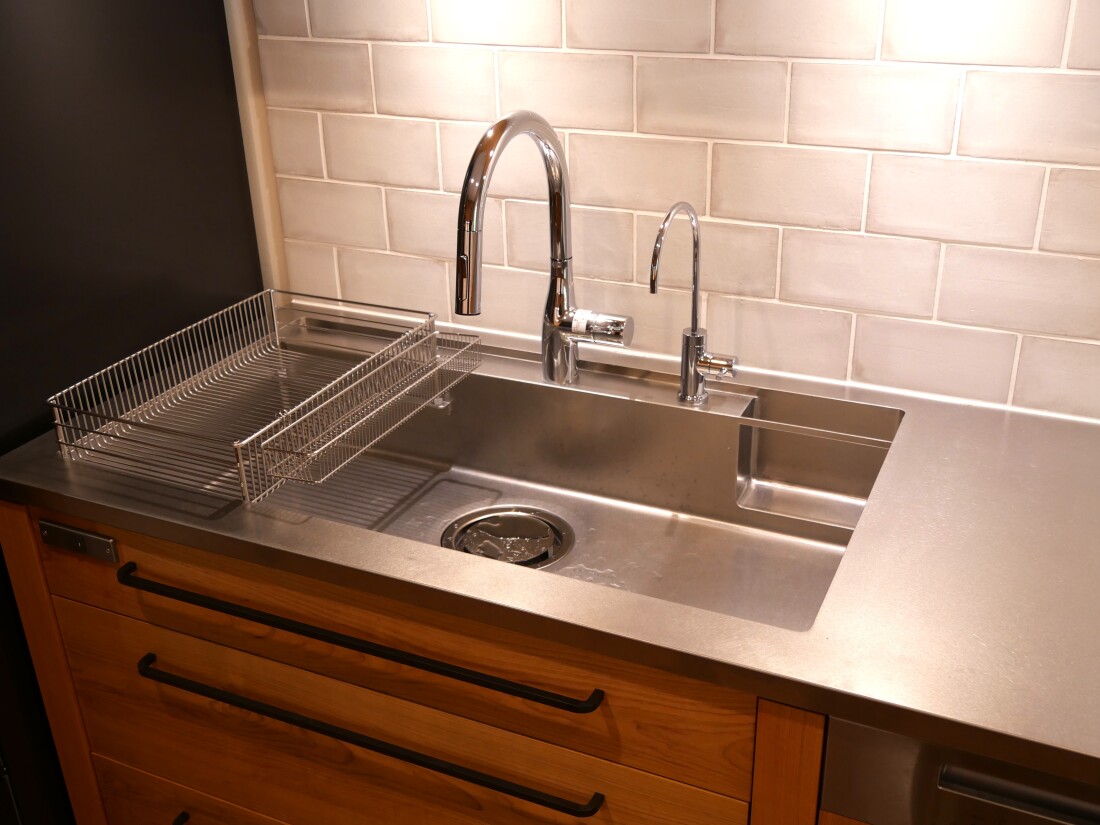 ママルとしては比較的めずらしいステンレスのワークトップですが、シンクは定番のママルオリジナル。